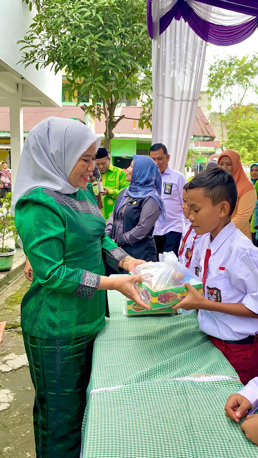 Usai menghadiri upacara Hari Jadi ke-21 Kabupaten Sergai, Bupati Darma Wijaya bersama unsur Forkopimda Sergai dan Ketua TP PKK Ny. Hj. Rosmaida Darma Wijaya menyerahkan makanan bergizi gratis di SD Negeri 108293 Kelurahan Simpang Tiga Pekan Kecamatan Perbaungan.