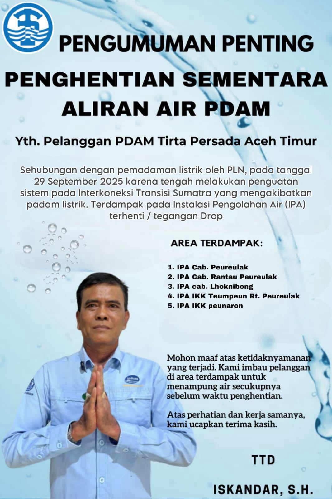 Karena itu, Manajemen Perumda Tirta Peusada Aceh Timur meminta maaf kepada pelanggan Air bersih dengan kondisi yang terjadi menjelaskan bahwa kondisi tersebut bukanlah ketersengajaan. Melainkan terjadi terdampak ikutan dari kegiatan lain yang terkait dengan pihak PLN dan terjadi di Aceh Timur, Direktur perusahaan Perumda Tirta Peusada Aceh Timur Iskandar minta maaf untuk sementara waktu.