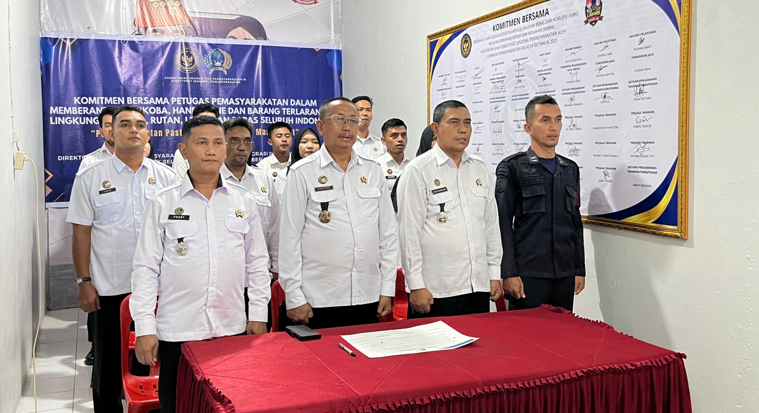 Aceh Timur , sinar sergai com.Dalam rangka memperkuat komitmen seluruh jajaran Pemasyarakatan terhadap upaya pemberantasan peredaran gelap narkoba, handphone, serta barang-barang terlarang lainnya di lingkungan Lembaga Pemasyarakatan (Lapas), Rumah Tahanan Negara (Rutan), Lembaga Pembinaan Khusus Anak (LPKA), dan Balai Pemasyarakatan (Bapas). Lapas Idi turut melaksanakan kegiatan Penandatanganan Komitmen Bersama Petugas Pemasyarakatan.