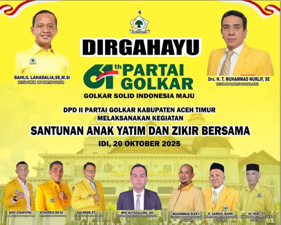 “Hari ini Puncak HUT Golkar Ke-61, kita di DPD II Golkar melakukan sukuran dan doa bersama, juga santunan ke anak yatim di Kantor DPD ll partai golkar kabupaten Aceh Timur , Senin (20/10/2025).