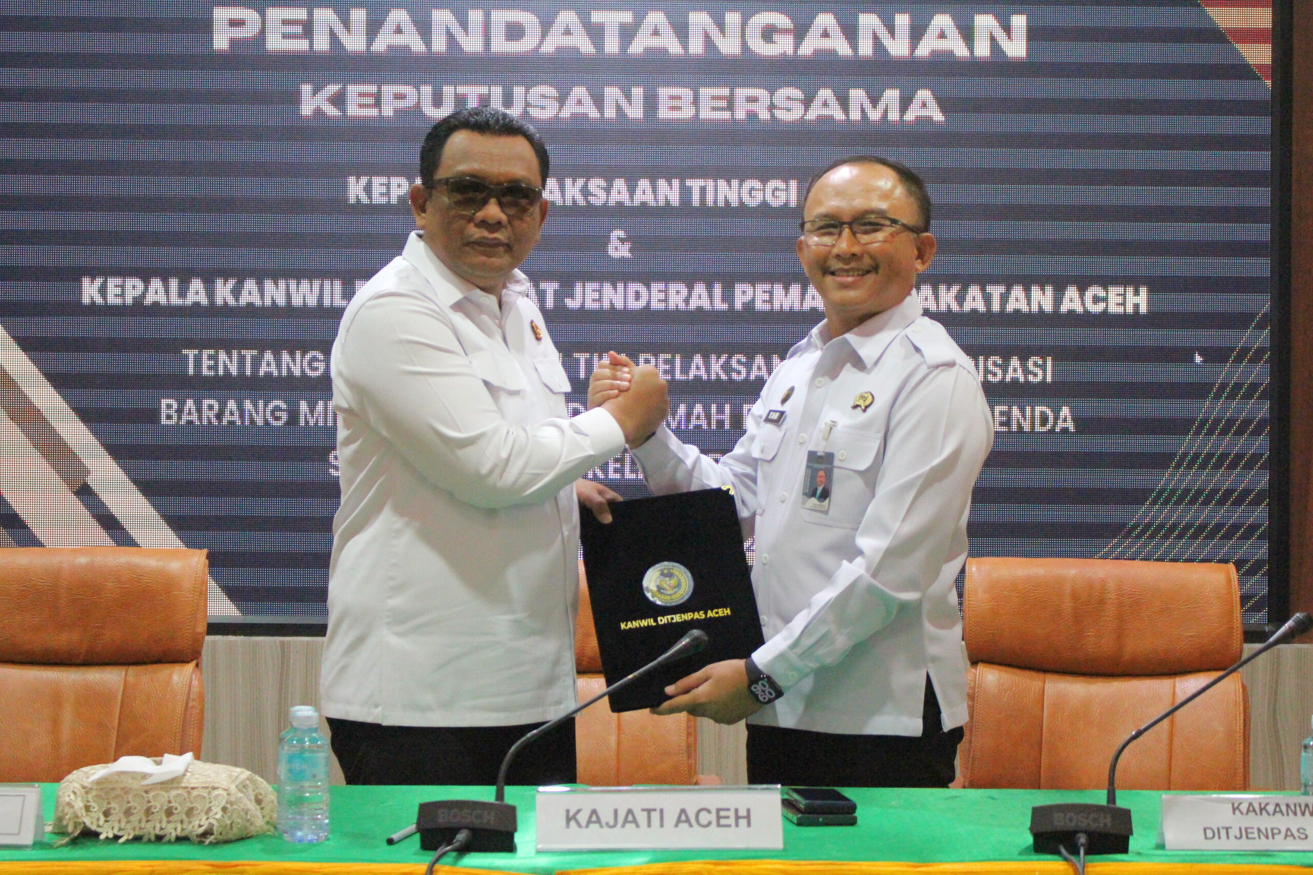 Banda Aceh, sinar sergai com. Dalam rangka memperkuat sinergi antar instansi dalam pengelolaan Barang Milik Negara (BMN), Kepala Kejaksaan Tinggi Aceh bersama Kepala Kantor Wilayah Direktorat Jenderal Pemasyarakatan (Ditjenpas) Aceh secara resmi menandatangani Keputusan Bersama (SKB) tentang Pembentukan Tim Inventarisasi BMN pada Rumah Penyimpanan Benda Sitaan Negara (Rupbasan) Kelas I Banda Aceh, Rabu (12/11/2025).