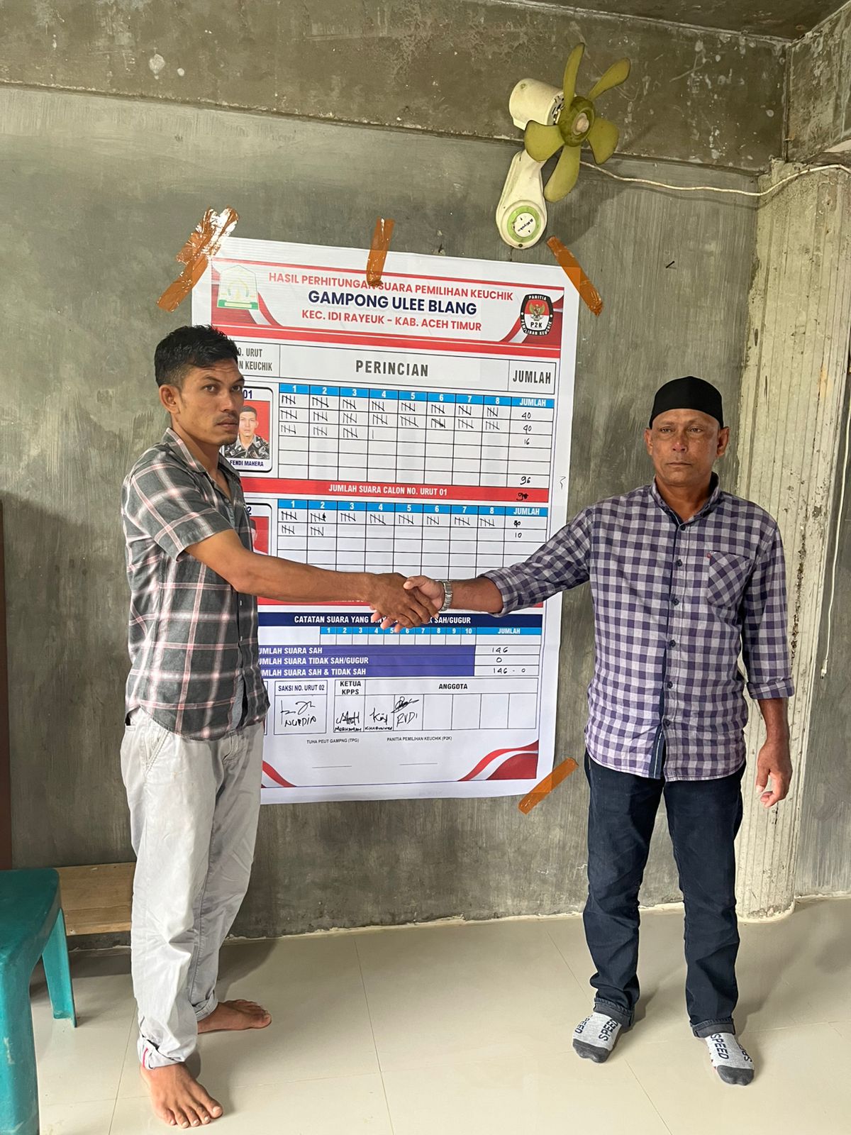 Aceh Timur, sinar sergai com.Fendi Mahera nomor urut 1 terpilih sebagai keuchik Gampong Ulee Blang kecamatan Idi Rayeuk Kabupaten Aceh Timur.