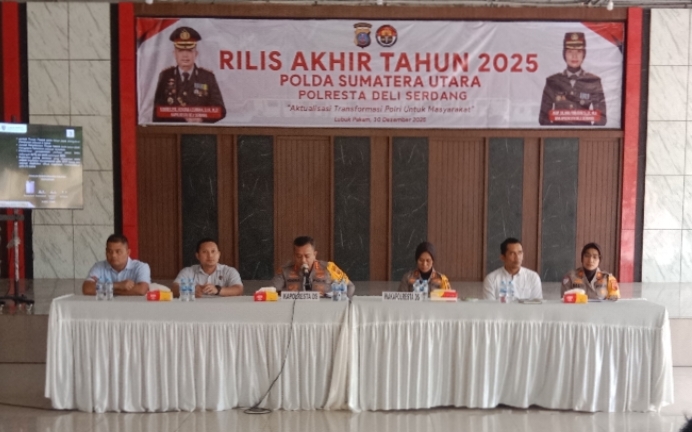 DELI SERDANG, Sinarsergai.com – Kepolisian Resor Kota (Polresta) Deli Serdang menggelar Rilis Akhir Tahun 2025 dengan tema “Aktualisasi Transformasi Polri Untuk Masyarakat” yang dipimpin langsung oleh Kapolresta Deli Serdang, Kombes Pol Hendria Lesmana, S.IK, M.Si.didampingi PJU Polresta Deli Serdang dan dihadiri oleh sejumlah Awak Media fi Aula Terbuka Polresta Deli Serdang, Selasa (30/12/2025).